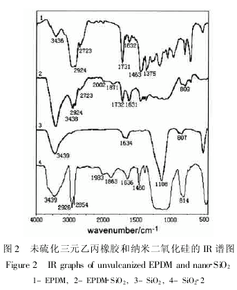 Kraus曲線表明納米二氧化硅與輻射硫化三元乙丙橡膠之間存在著相互作用。為了進一步探討納米二氧化硅與三元乙丙橡膠之間的相互作用本質(zhì),采用紅外光譜分析未經(jīng)輻射硫化的納米二氧化硅填充膠,并與未硫化的無填料三元乙丙橡膠和納米二氧化硅做對比。