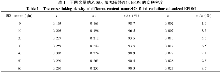 表中x代表輻射硫化乙丙橡膠在二甲苯中達到平衡溶脹時測得的表觀交聯(lián)密度,x1表示輻射硫化膠在二甲苯-氨氣氣氛下到達平衡溶脹時測得的表觀交聯(lián)密度,x2為(x-x1)差值。x即為填充膠的總交聯(lián)密度,x1代表了化學交聯(lián)密度,它包括橡膠分子鏈的交聯(lián)、死纏結(jié)以及納米二氧化硅和乙丙橡膠分子之間可能存在的化學交聯(lián),而x2代表了二氧化硅與乙丙橡膠之間的氫鍵和其他的物理相互作用。同時表中也分別列出了化學交聯(lián)密度和物理交聯(lián)密度占硫化膠總密度的比率x1/x、x2/x。