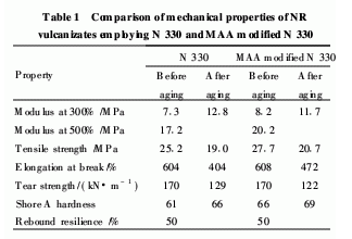由表1可以看出,添加MAA改性炭黑N 330比添加普通炭黑N 330的NR硫化膠300%定伸應(yīng)力、500%定伸應(yīng)力、拉伸強(qiáng)度、邵爾A型硬度有明顯提高;且老化后仍保持較高的拉伸強(qiáng)度、邵爾A型硬度、扯斷伸長(zhǎng)率,但300%定伸應(yīng)力有一定幅度的下降。MAA改性炭黑N 330對(duì)NR硫化膠的撕裂強(qiáng)度、回彈性影響不大。