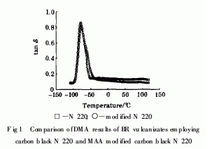 由圖1可以看出,添加MAA改性炭黑N 220的BR硫化膠在60℃附近的損耗因子(tanδ)明顯小于添加普通炭黑N 220的BR硫化膠。這說(shuō)明添加MAA改性炭黑N 220有利于降低BR硫化膠的滾動(dòng)阻力。