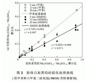 在堿性條件下,于過量四乙氧基硅烷存在的條件下浸漬白炭黑試樣,測定表面處理的程度。這樣,可使膠體白炭黑表面的三甲硅烷基和二甲基乙烯基甲硅烷基,分別轉(zhuǎn)化為乙氧基三甲基硅烷和乙氧基二甲基乙烯基硅烷。經(jīng)氣相色譜分析(GC),未觀察到含三甲基甲硅烷基或二甲基乙烯基甲硅烷基的高分子量物質(zhì)。每種烷氧基硅烷的量可用氣相色譜宋確定,SiO2的濃度由差值法測出。