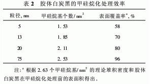 除了對三甲基甲硅烷基的優(yōu)先選擇外,還觀察到了處理后白炭黑表面發(fā)現(xiàn)的甲硅烷基總數(shù)與處理?xiàng)l件的依存關(guān)系。為了對處理效率加以描述,可把實(shí)際的甲硅烷基總數(shù)與存在于給定白炭黑粒子上的甲硅烷基理論總數(shù)進(jìn)行比較。某文獻(xiàn)[1]中記載,白炭黑表面平均擁有4個(gè)硅烷醇/nm2~10個(gè)硅烷醇/nm2,具體取決于測定方法、白炭黑種類和表面積(S.A)。在這里,假定理論上白炭黑擁有的甲硅烷基數(shù)為5個(gè)硅烷醇/nm2。由于空間位置等原因,處理后白炭黑表面上能配合(鑲嵌)的甲硅烷基最大數(shù)目約為2.63個(gè)硅烷醇/nm2。該值在很大程度上也依賴于測定方法?;谶@些數(shù)目,用GC法測得了白炭黑表面積和甲硅烷基的總數(shù),計(jì)算出了表面覆蓋率(%)值。如表2所示,表面覆蓋率值介于50%~100%之間,單位表面積的甲硅烷基總數(shù)隨粒徑的增大而增加,如表2所示。表面覆蓋率隨著粒徑的增大而增加,這多少跟理論有些背道而馳———因?yàn)楦鶕?jù)幾何因素,人們認(rèn)為較小粒子的較大曲率會(huì)使白炭黑每單位表面積存在著更多的甲硅烷基團(tuán)。