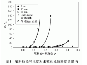 對各種預(yù)硫化橡膠進(jìn)行測定,以下把η填充/η未填充=η/η0描述為填料填充量的函數(shù)。觀察一下圖3就可以看出白炭黑粒徑和體積分?jǐn)?shù)對材料粘度的影響。對于用粒徑為13 nm和20 nm的三甲基硅烷處理的白炭黑,填充體系的粘度仍類似于未填充聚合物的粘度。其填充量超過35%(體積份)時(shí),粘度才迅速增大。在填充5 nm白炭黑粒子的體系(填充量超過0.20)中也觀察到了類似的行為。