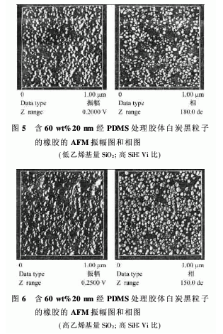 通過原子力顯微鏡(AFM)對充分硫化的橡膠進(jìn)行了分析。AFM觀察保證了白炭黑在聚合物基體內(nèi)達(dá)到充分分散而不是聚集。研究表明,分散本身會(huì)大大影響硫化橡膠的性能。含60 wt%的低乙烯基甲硅烷化處理填料和高乙烯基甲硅烷化處理填料這兩種代表性試樣的振幅圖和相圖分別示于圖5、圖6。相圖特別清楚地顯示出離散的粒子間清晰的邊界以及填料在聚合物基體內(nèi)的分散。盡管在這里沒有表示出來,5μm×5μm的AFM圖像表明,相對來說,兩種試樣之間的分散沒有差別,未顯示出有任何明顯的聚集體形成。而且,在亞微水平程度觀察這兩種試樣的相圖圖像發(fā)現(xiàn),低乙烯基處理填料和高乙烯基處理填料,其平均直徑分別為27.6 nm±9.69 nm和32.5 nm±9.90 nm。這些結(jié)果雖然略高,但卻處于由TEM實(shí)驗(yàn)測得的那些值的誤差范圍之內(nèi),充分說明并沒有發(fā)生顯著的聚集。不過,要注意的是,盡管兩種試樣的聚集程度看起來不大,分散也相對較好,但高乙烯基填料聚集成簇的程度稍大一些。這也許是由于粒子的極性增大和/或只是填料的機(jī)械混合較差引起的某種填料-填料的締結(jié)所致。這就可以解釋為什么聚合物-填料基本粘度與乙烯基含量之間存在著微弱的依存關(guān)系。但是,應(yīng)當(dāng)注意到,由于AFM對所分析的試樣范圍、拍攝參數(shù)、圖像質(zhì)量具有很強(qiáng)的依賴性這一事實(shí),此項(xiàng)技術(shù)對測定聚集和分散的微小差異可能并非最佳,因而必須細(xì)心觀察。當(dāng)然,這些結(jié)果仍為經(jīng)甲硅烷化處理的白炭黑的混煉分散提供了證據(jù)。