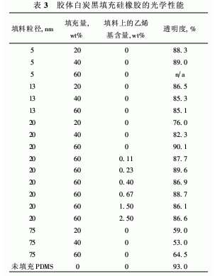 用透明度(透光率,%)表征二次硫化橡膠的光學(xué)性能(見表3)。對填充與未填充PDMS體系進(jìn)行比較,可以看出三甲基甲硅烷處理填料的粒徑和填充量的影響。濃度高達(dá)60 wt%時(shí),粒徑在5 nm~20 nm的粒子都具有極其優(yōu)良的透明度。白炭黑粒子的波長比可見光的波長短得多,因而具有高透明度,且不會(huì)引起任何散射。相反,75 nm的較大粒子形成的網(wǎng)絡(luò)會(huì)使透明度明顯降低,在外觀上也是不透明的。填料的乙烯基處理對橡膠的光學(xué)性能亦有影響。對于恒定的粒徑(20 nm),填料的乙烯基處理程度的增加使得透光率略有下降。這種影響起源于相鄰白炭黑表面的交聯(lián)密度增大,和/或前面所說的填料-填料締結(jié)。