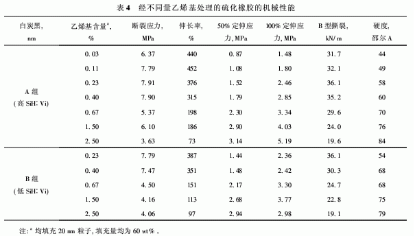 采用拉伸試驗(yàn)、撕裂試驗(yàn)及硬度試驗(yàn)來表征硫化橡膠的機(jī)械性能。針對在恒定填充量(60 wt%)下經(jīng)不同乙烯基量處理的填料,表4列出了這些試驗(yàn)的結(jié)果。兩組橡膠因兩種不同的SiH∶乙烯基(Vi)比產(chǎn)生的機(jī)械性能的差別似乎并不大。測定50%和100%伸長時(shí)的應(yīng)力值(σ50%,σ100%)能夠?qū)γ糠N物料的韌度作出估計(jì)和比較。這些值表明,隨著填料的乙烯基處理量的增加,韌度明顯提高。同樣,硬度值也隨著乙烯基含量的增加而增大,這說明填充后橡膠比較硬。除填充0.03%乙烯基外,隨著乙烯基含量的增加,對兩種SiH∶Vi比(A組和B組),其斷裂應(yīng)力(σb)都從7.8 MPa減小至4.0 MPa。伸長率也有類似的趨勢,由大約400%急劇下降為100%,降低了80%左右。橡膠另一重要性能是抗撕裂性。多個(gè)撕裂試驗(yàn)結(jié)果表明,含有較少乙烯基填料(約0.23 wt%)的橡膠的抗撕裂性的值至少比用高于2.5 wt%乙烯基填料制備的橡膠大40%。然而,一旦乙烯基含量接近0.23 wt%,甚至更低的量(如0.03 wt%),撕裂性能有明顯的最大值。