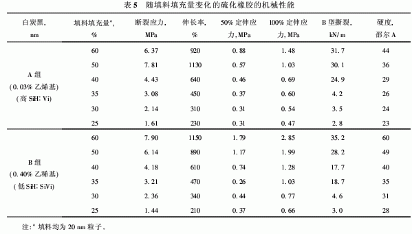 此外,還考察了填料填充量對硅橡膠機(jī)械性能的影響。由含0.03 wt%和0.40 wt%乙烯基填料構(gòu)成的兩組試樣示于表5。對于所有這些試樣,粒徑(20 nm)和SiH∶Vi比保持不變。