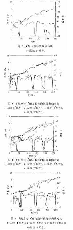 TESPD/ZB并用具有提高膠料加工性能和物理性能的協(xié)同效應(yīng)?;鞜捛€表明,膠料加工性能的改善主要來自于添加的ZB,膠料吃粉快,混煉轉(zhuǎn)矩明顯降低。圖2~5示出了不同配合劑對混煉曲線的影響。結(jié)果表明,添加ZB可以明顯縮短混煉時間,減小輸入功率。在本研究中,不能確定這種添加劑對哪種填料的影響最大?;鞜捛€形狀和較快的吃粉峰表明,使用TESPD /ZB并用體系膠料的均勻性和分散性較好。下降后的溫度還足以實(shí)現(xiàn)較好水平的硅烷化。