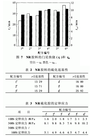 TESPD和ZB都影響NR膠料的焦燒性能。6#配方膠料的抗焦燒性能最好,硫化時間稍有延長(見圖7)。這些膠料的抗硫化返原性能部分來自TESPD,部分來自ZB,但并用體系效果最好(見表2)。
