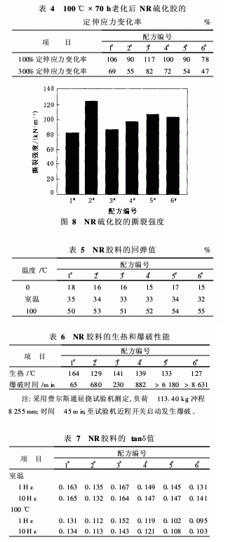 用100%定伸應(yīng)力測量的交聯(lián)效率表明,TESPD的貢獻(xiàn)大于ZB。但是, TESPD/ZB并用體系膠料的硫化程度最高(見表3)。熱氧老化試 驗(yàn)結(jié)果(見表4)表明, TESPD/ZB并用體系膠料的定伸應(yīng)力變化率較小。抗撕裂性能基本保持不變(見圖8)。