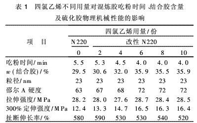 (1)用四氯乙烯處理后的炭黑,降低了粒子間的物理吸附性,混煉時(shí)炭黑能快速向橡膠相擴(kuò)散,提高了炭黑在橡膠中的分散速度,縮短了混煉時(shí)間。
