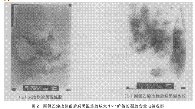 圖2是炭黑混煉膠被甲苯浸泡后,用超聲波分散5 min后的電鏡照片。由圖2可見,未經(jīng)四氯乙烯處理的炭黑外面包裹的橡膠幾乎全被甲苯浸泡掉了,已經(jīng)裸露出了炭黑粒子。而經(jīng)四氯乙烯改性處理的炭黑混煉膠,雖經(jīng)甲苯浸泡過但外表面仍被橡膠包裹住,顯微鏡下顯現(xiàn)的是一團(tuán)團(tuán)潑墨,無法分辨炭黑的本來面目。