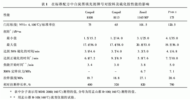 為了評估白炭黑填充劑的性能,在標(biāo)準(zhǔn)膠料(前蘇聯(lián)技術(shù)條件ТУ2168-038-00204872-2001)中也進行試驗。膠料用實驗室開煉機制備。試驗表明,Zeosil 1165 MP具有最大的補強性能(見表1);在這種情況下,用MDR 2000測得的硫化膠的硫化特性及500%定伸應(yīng)力也比較高。含有Coupsil 8113的膠料具有最低的門尼粘度,這證明,含有這種白炭黑填充劑的膠料加工性能良好。