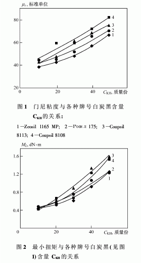 膠料性能取決于白炭黑的含量。對所得到的關(guān)系曲線的分析表明,加大白炭黑含量下,性能變化的特征與白炭黑的品種無關(guān)。這表明,白炭黑含量不同,含有Coupsil 8108的膠料的粘度最高,而含有Zeosil 1165 MP的膠料的粘度最低;含有Coupsil 8113和Росил175的兩種膠料的粘度居中,其中含有Росил175的膠料的粘度值與含Zeosil 1165 MP的膠料的粘度值十分接近(見圖1)。因此,同含有其它白炭黑的膠料相比,含有Zeosil 1165 MP膠料的加工比較容易進行。最小扭矩的變化特征實際上是相同的(圖2)。然而,在白炭黑含量小的情況下(在30質(zhì)量份以下),最小扭矩值與白炭黑的品種無關(guān)。因此,根據(jù)未硫化膠料的性能,含有分別加入有機硅烷的幾種膠料,無論是含Zeosil 1165MP的還是含Росил175的,都表現(xiàn)出某些優(yōu)點。