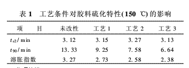 (2)改性膠料:分為3種工藝于高溫下在開煉機上完成生膠、白炭黑和改性劑的原位接枝反應(yīng)過程,具體改性工藝見文獻[10]。其中工藝1同未改性工藝;工藝2改性條件為140℃×5 min;工藝3改性條件為160℃×5 min。然后在開煉機上依次加入活性劑、防老劑、硫化劑和促進劑等進行混煉。