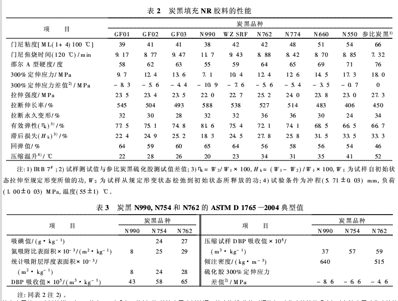 炭黑GF01,GF02和GF03及其硫化膠性能基本達到設(shè)計要求,炭黑GF01,GF02和GF03可分別全部或部分替代炭黑N990,N754和N762用于橡膠制品。