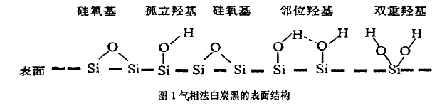 氣相法白炭黑是硅橡膠中常見補(bǔ)強(qiáng)填料的一種,是鹵硅烷在氫氧焰中高溫水解得到的無(wú)定形二氧化硅產(chǎn)品,粒子尺寸小,比表面積大。由于氣相法白炭黑是鹵硅烷水解生成的,所以有許多硅羥基(si-OH)殘留在二氧化硅表面或者聚集體內(nèi)部。殘留在聚集體內(nèi)部的硅經(jīng)基需在較高溫度(850℃以上)下才能去除,也難以檢測(cè),但他們對(duì)產(chǎn)品的性能影響不大;殘留在表面的硅獨(dú)基活性比較高,對(duì)產(chǎn)品性能的影響很大。硅握基一般以孤立、相鄰和雙重等幾種形式存在于氣相法白炭黑表面(見圖1)。表面硅獨(dú)基的存在使氣相白炭黑極易吸附水分子,影響其使用效果;同時(shí),表面過(guò)多的輕基的存在,也使其與有機(jī)化合物的相容性下降。而且還容易與硅橡膠中的氧形成氫鍵,導(dǎo)致膠料結(jié)構(gòu)化。