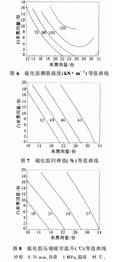 從圖3~8可以看出,隨著炭黑和白炭黑用量增大,硫化膠的300%定伸應力均增大,但炭黑用量對300%定伸應力的影響較白炭黑明顯;拉伸強度和拉斷伸長率均呈減小的趨勢,而且炭黑用量對拉斷伸長率的影響比白炭黑明顯;撕裂強度呈上升趨勢;回彈值呈下降趨勢;壓縮疲勞溫升呈上升趨勢,且炭黑的影響比白炭黑大。