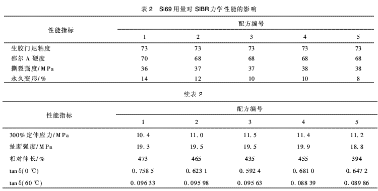 表2中所有配方的橡膠的tanδ(0℃)值都較高,說明SIBR具有良好的抗?jié)窕?Si69用量對(duì)橡膠的抗?jié)窕阅軟]有影響;而tanδ(60℃)值隨著Si69用量的增加而逐漸減小,說明Si69能夠明顯改善白炭黑在橡膠SIBR中的分布,并且Si69用量達(dá)到白炭黑用量的10%時(shí),tanδ(60℃)值達(dá)到最低,即滾動(dòng)阻力最小。