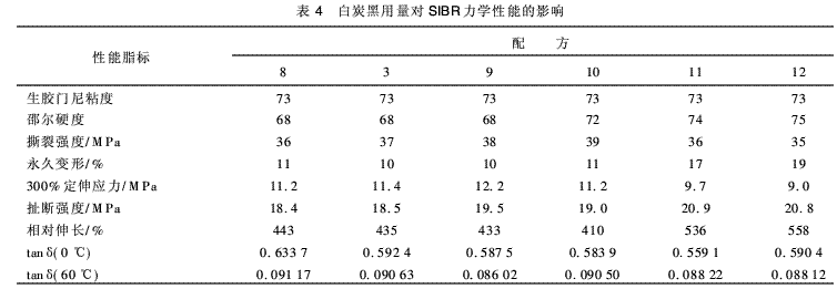 從表4可以看出,隨著白炭黑用量的增多,SIBR各種性能的變化基本符合上述規(guī)律,但當(dāng)白炭黑用量超過20份,撕裂強(qiáng)度和300%定伸應(yīng)力變小,相對(duì)伸長和永久變形增大,說明白炭黑用量達(dá)到一定值后,就會(huì)產(chǎn)生過剩的白炭黑不能和橡膠生成共價(jià)鍵,這主要是因?yàn)镾IBR本身含可以參與化學(xué)反應(yīng)的雙鍵有限引起的,使得過剩的白炭黑只能靠物理作用圍繞在橡膠周圍,減弱了它本身的補(bǔ)強(qiáng)效果,另一方面單獨(dú)存在的白炭黑對(duì)于橡膠網(wǎng)絡(luò)起到一定稀釋作用;所以當(dāng)白炭黑用量達(dá)到一定值,再繼續(xù)增加其用量,對(duì)SIBR的很多性能均產(chǎn)生不利的影響,即撕裂強(qiáng)度和300%定伸應(yīng)力變小,相對(duì)伸長和永久變形增大。