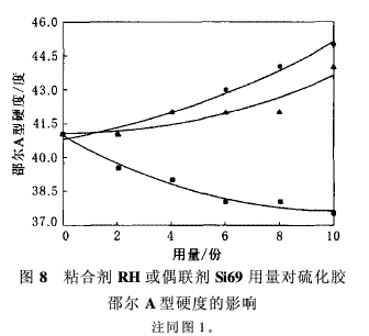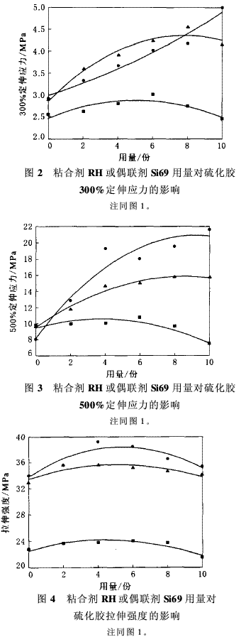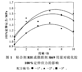 氣相法白炭黑是重要的白色補(bǔ)強(qiáng)填料,為了減小輪胎的滾動阻力、降低車輛的燃油消耗和減輕尾氣污染[1],白炭黑在輪胎中的應(yīng)用勢在必行;在非輪胎橡膠制品中,氣相法白炭黑可以明顯提高橡膠制品的撕裂強(qiáng)度和耐老化性能。因此,白炭黑的應(yīng)用已經(jīng)引起人們的廣泛關(guān)注[2~5]。本工作在改性氣相法白炭黑填充NR膠料中加入粘合劑RH,制備NR/改性氣相法白炭黑復(fù)合材料,研究粘合劑RH用量對復(fù)合材料性能的影響,并與偶聯(lián)劑Si69/氣相法白炭黑膠料進(jìn)行對比。