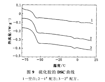 各膠料的DSC曲線如圖9所示。由圖9可以看出,空白、1#和2#配方硫化膠的玻璃化溫度分別為-58.89,-57.63和-56.24℃??梢?兩種改性氣相法白炭黑及粘合劑RH的加入對硫化膠的玻璃化溫度有一定影響,這是由于納米粒子的加入對橡膠分子鏈段的運(yùn)動起到了一定的限制作用,從而使玻璃化溫度升高。