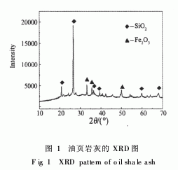 油頁巖灰的XRD如圖1所示,油頁巖灰中主要造巖礦物質(zhì)為硅鋁酸鹽,由圖1可知SiO2主要以石英形式存在,Fe2O3以赤鐵礦形式存在。對油頁巖灰分別采用酸堿離解方法,通過化學(xué)反應(yīng)改變各組分的溶解性,并改變SiO2的形態(tài),從而制備出白炭黑產(chǎn)品。