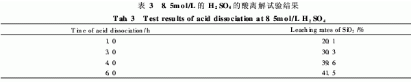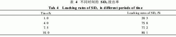表5是采用8. 5mol/L的H2SO4,在不同溫度下離解4. 0h的實(shí)驗(yàn)結(jié)果,如表5所示,隨著離解溫度的升高, SiO2的浸出率越高,因此本文采用酸離解溫度為90℃。