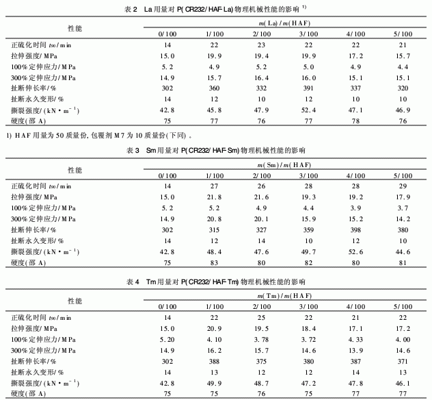 采用Y(釔)、La(鑭)、Ce(鈰)、Pr(鐠)、Nd(釹)、Rb(銣)、Tb(鋱)、Dy(鏑)、Ho(鈥)、Er(鉺)、Tm(銩)及Sm(釤)等12種稀土分別摻雜炭黑,得到HAF-Ln,制備得到了12種P(CR232/HAF-Ln),其硫化膠的物理機械性能如表1所示