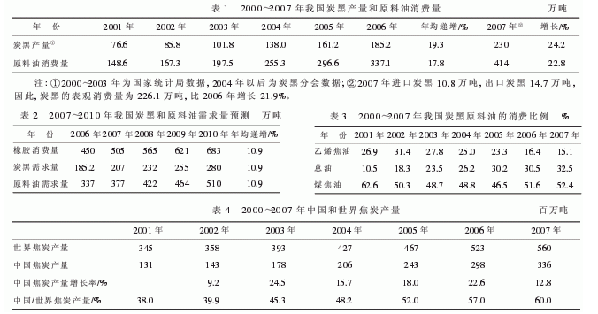 隨著中國汽車和輪胎工業(yè)的快速發(fā)展,炭黑的需求量和產(chǎn)量也快速增長,炭黑工業(yè)對原料油的需求量不斷增加。2007年中國的炭黑產(chǎn)量為230萬噸,原料油的估算消費量為414萬噸,和2006年比,分別增長24.2%和22.8%,二者增長率不同是由于原料油單位消耗的降低。2000~2007年我國炭黑產(chǎn)量和原料油消費量見表1,2007~2010年我國炭黑和原料油需求量預(yù)測見表2。