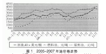 煤焦油的價格取決于焦炭生產(chǎn)、煤焦油加工及其下游產(chǎn)品的市場狀況,市場對炭黑原料油和燃料油的需求,以及燃料油的價格。2005~2007年油價格走勢見圖1。