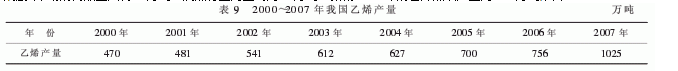 2000~2007年我國乙烯產(chǎn)量見表9。由于國內(nèi)市場對塑料的巨大需求,在建的項目很多,到2010年我國的乙烯生產(chǎn)能力將達(dá)到1780萬噸。乙烯焦油的產(chǎn)量沒有見到正式的統(tǒng)計,據(jù)有關(guān)專家估算,2006年乙烯焦油的產(chǎn)量約180萬噸,其中大部分用作乙烯工廠的廠內(nèi)燃料,提供市場的商品量只有70萬噸。炭黑行業(yè)用量約為56萬噸。預(yù)測2010年的乙烯焦油產(chǎn)量為320萬噸,其中商品量約100萬噸。
