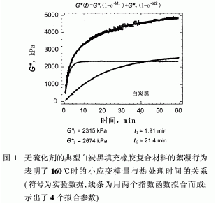 圖1示出典型的白炭黑填充橡膠膠料(未加硫化劑)在160℃的絮凝行為,可以看出小應(yīng)變模量隨著后熱處理時間增加而增大。這些數(shù)據(jù)是利用橡膠加工分析儀獲得的,表明了正如小應(yīng)變模量所檢測的那樣,硬度在熱處理期間明顯增大。這表明粒子發(fā)生了相對運動,填料網(wǎng)絡(luò)的形成取決于粒子的尺寸、聚合物的種類以及聚合物-填料間的相互作用和填料-填料間的相互作用。圖1中的符號為實驗數(shù)據(jù),線條為擬合曲線,證明分別通過具有短松弛時間t1和長松弛時間t2的兩個指數(shù)過程之和,很好地描述了絮凝現(xiàn)象。