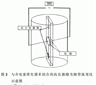 流變儀中有一根狹縫毛細管,兩根電極固定于與狹縫平行的毛細管內(nèi)。電極與毛細管壁是絕緣的。將這兩根電極與頻率響應(yīng)分析儀相連接,以便進行介電測定。實驗在100℃的溫度下進行。活塞速度由0.0001mm/s變?yōu)?.4mm/s,并在流變儀內(nèi)按不同的活塞速度獲得剪切速率。用3個壓力傳感器來探測包括1000、700和350 Pa的壓力降,這些傳感器的安裝與毛細管的狹縫保持平行。當流體以一定的活塞速度趨于恒定時,在10-1~106Hz的頻率范圍內(nèi)進行介電測定。與介電寬帶光譜儀相連的高壓狹縫毛細管流變儀的實驗裝置示意圖見圖2。