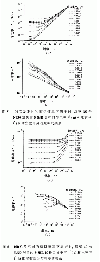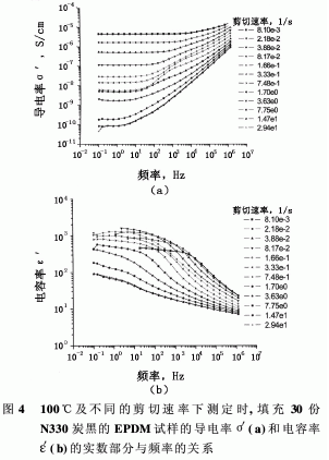 填充30份炭黑的EPDM在不同溫度時,其粘度和剪切應(yīng)力隨剪切速率的變化示于圖3。顯而易見,粘度隨著溫度及剪切速率的增加而降低,具有-0.7指數(shù)的冪律行為由此得到了充分的證明。圖4中示出100℃下無交聯(lián)劑時同一種膠料的導(dǎo)電率對剪切速率的相應(yīng)的依賴關(guān)系。該實驗是流動狀態(tài)下在高壓毛細管流變儀內(nèi)進行的。可以看出,對于所有的剪切速率,低頻導(dǎo)電率(它等于直流導(dǎo)電率的平臺段)隨著剪切速率的增大而降低。由于炭黑具有導(dǎo)電的性質(zhì),通過介電寬帶光譜術(shù)就能在很寬的頻率范圍內(nèi)探測出填料網(wǎng)絡(luò)的破壞情況。在范圍甚寬的導(dǎo)電率和電容率水平中能夠看到這樣的變化。