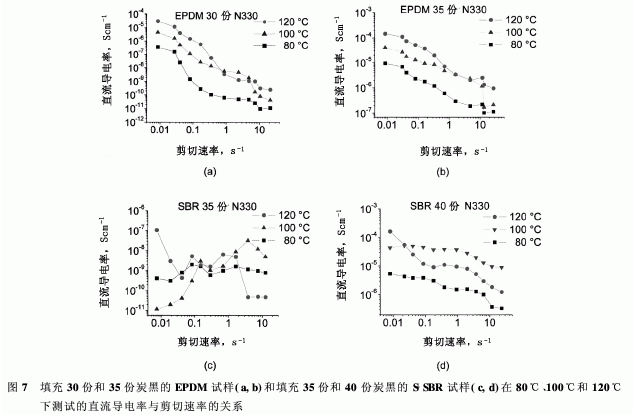 電容率低于及高于滲透閾的不同定性狀況可能與臨界剪切速率或剪切應(yīng)力相關(guān),填料團簇在達到滲透閾時開始解體。文獻表明,根據(jù)較大的指數(shù)2+df,B(df,B≈1.8)是(CCA)團簇的主鏈分維的冪定律,相應(yīng)的臨界破裂應(yīng)力隨著團簇尺寸的增加而增大。但是,即使對于更大的指數(shù)3+df,B團簇應(yīng)變也會增大,導(dǎo)致團簇的臨界尺寸反過來依賴于橡膠基質(zhì)周圍的外加應(yīng)力。因此,較大的團簇比較小的團簇更容易破壞,團簇的尺寸增加,臨界剪切應(yīng)力減小。這可以定性地解釋為什么高于滲透閾時,呈現(xiàn)出大的炭黑團簇的EPDM試樣在團簇出現(xiàn)破裂處表現(xiàn)出更小的臨界剪切應(yīng)力。相反,S-SBR試樣在低于滲透閾時僅呈現(xiàn)出小的團簇,這些團簇在較大的剪切速率解體,導(dǎo)致導(dǎo)電率在高剪切速率下降低。當填料配合量增加到40份時(圖6),發(fā)現(xiàn)最低的剪切速率(9.13×10-3s-1)其導(dǎo)電率平臺大約為10-4Scm-1。這就表明該體系處于滲透閾之上。因而,在適中的剪切速率(≈10-1s-1)下臨界剪切應(yīng)力低,導(dǎo)電率隨著剪切流的增大而開始降低。雖然在更高的剪切速率下填料團簇繼續(xù)發(fā)生解體,導(dǎo)電率平臺卻僅降低了不到10個單位。這說明由于相對較高的填料配合量,聚集體間的距離非常小,流動引起的傳導(dǎo)鍵破壞和重構(gòu)對導(dǎo)電率的影響并不明顯。圖7示出了炭黑含量分別為30份和35份的EPDM和炭黑含量分別為35份和40份的S-SBR,推算的直流導(dǎo)電率平臺隨剪切速率變化的情形。對于EPDM而言,導(dǎo)電率水平隨剪切速率的增加而同步降低,清楚地表明了填料網(wǎng)絡(luò)在剪切流狀態(tài)下發(fā)生破壞的現(xiàn)象。對于這些體系,觀察到在整個剪切速率范圍內(nèi)導(dǎo)電率水平隨著溫度增加而提高,說明電荷遷移是通過電子在相鄰炭黑聚集體間的納米級縫隙的熱激活跳躍發(fā)生的。填充35份炭黑的S-SBR的變化表明,填料的配合量尚未達到滲透閾。在這里,數(shù)據(jù)的離散性很大,無法觀察到明顯的趨勢,盡管從總體上來看,120℃時的行為似乎與100℃和80℃時的行為并不相同。在120℃時,從導(dǎo)電率水平的降低可再次看到填料網(wǎng)絡(luò)的破裂,這就說明在高溫下發(fā)生了絮凝。對于填充40份炭黑的S-SBR觀察到了與EPDM體系相似的趨勢,因為這種復(fù)合材料又超過了滲透閾。