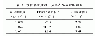 選定水玻璃密度為1. 059 g/cm3,反應(yīng)溫度70℃,陳化時(shí)間2 h,分別以NH4HCO3溶液滴加到水玻璃溶液中(a)、水玻璃溶液與NH4HCO3溶液并行加料(b)、水玻璃溶液滴加到NH4HCO3溶液中(c), 3種加料方式做對(duì)比實(shí)驗(yàn)。以比表面積和DBP吸油值作評(píng)價(jià)指標(biāo),結(jié)果列于表1。由表1可以看出,加料方式對(duì)白炭黑質(zhì)量的影響很大。將水玻璃溶液滴加到NH4HCO3溶液中所得到的白炭黑的質(zhì)量最好。這是因?yàn)閜H對(duì)白炭黑的質(zhì)量有很大的影響。將水玻璃溶液滴加到NH4HCO3溶液的整個(gè)過程中,體系的pH變化較小,在8到9之間,使得白炭黑在弱堿性環(huán)境下生成,質(zhì)量較a和b好。