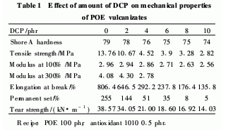 a)采用DCP交聯(lián)POE,POE的主要物理機(jī)械性能都比未交聯(lián)前有所下降,且DCP用量越大,性能下降越明顯。