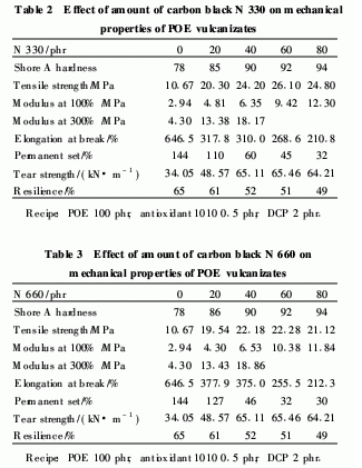 2·2 炭黑用量對POE物理機(jī)械性能的影響從DCP用量對POE物理機(jī)械性能的影響可以看出,要提高交聯(lián)POE的性能,只加入DCP并不能達(dá)到要求,必須對材料進(jìn)行增強(qiáng)。從表2和表3可以看出,無論是炭黑N 330還是N 660,對POE硫化膠的增強(qiáng)效果都十分明顯,且粒徑小的炭黑N 330對硫化膠的增強(qiáng)效果比粒徑較大的N 660更好, POE硫化膠的拉伸強(qiáng)度和撕裂強(qiáng)度也有較大程度的提高。從炭黑增強(qiáng)POE硫化膠的綜合性能來看,炭黑的最佳用量為60份。隨炭黑用量的增大,POE硫化膠的邵爾A硬度逐漸增大,回彈性逐漸減小,拉伸強(qiáng)度和撕裂強(qiáng)度逐漸增大;當(dāng)炭黑用量增大到一定程度后, POE的物理機(jī)械性能則出現(xiàn)降低趨勢。這是由于過量的炭黑會對POE產(chǎn)生“稀釋效應(yīng)”,致使炭黑粒子與粒子間接觸緊密,在實(shí)際的混煉時(shí)間內(nèi)不能很好地分散,從而出現(xiàn)許多大顆粒的炭黑團(tuán)粒;同時(shí)聚烯烴分子無法穿透到炭黑團(tuán)粒內(nèi)部與炭黑相作用,所以導(dǎo)致材料的拉伸強(qiáng)度下降。