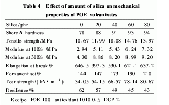 c)用白炭黑增強(qiáng)POE硫化膠,硫化膠的物理機(jī)械性能明顯增強(qiáng),其最佳用量為40份。
