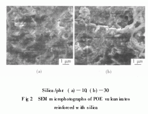 圖2顯示,白炭黑在POE硫化膠中有較好的分散。30份白炭黑填充的POE硫化膠其斷面比較粗糙,這樣的形態(tài)結(jié)構(gòu)說明白炭黑與POE之間的結(jié)合能力比較強(qiáng)