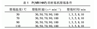塑煉實(shí)驗(yàn)設(shè)備為Brabender Plasticorder PLE651型轉(zhuǎn)矩流變儀所配的N50H混煉頭,填充系數(shù)取為0.75,每批混煉量為(67±1)g。塑煉條件如表1所示。