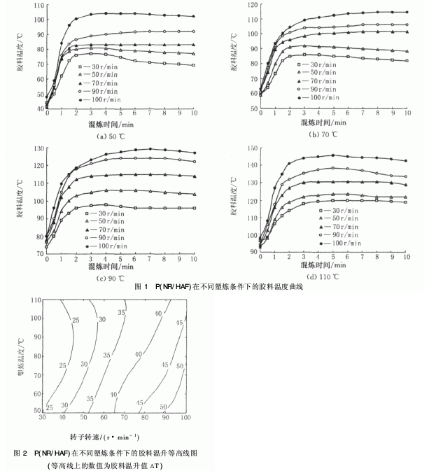 圖1是P(NR/HAF)在不同塑煉條件下的膠料溫度曲線。由圖1可見,膠料的溫度在最初的2~3 min內(nèi)急劇上升,之后趨于緩和。隨著塑煉轉(zhuǎn)速的增加,膠料溫度上升速度也加快,達(dá)到平衡時(shí)的溫度也更高。