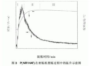 圖3是P(NR/HAF)在密煉機(jī)塑煉過程中的溫升示意圖,由圖3可見,P(NR/HAF)膠料在密煉室的塑煉過程中,其溫升過程可分為三個(gè)階段[1]: