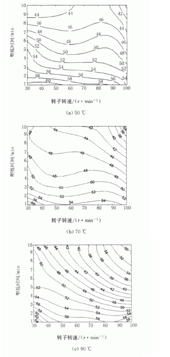 圖4是不同塑煉溫度下P(NR/HAF)膠料的門尼粘度與塑煉時(shí)間和塑煉轉(zhuǎn)速之間的等高線曲線圖。其中,未經(jīng)塑煉的P(NR/HAF)膠料的門尼粘度MS100℃(1+4)為84.2。