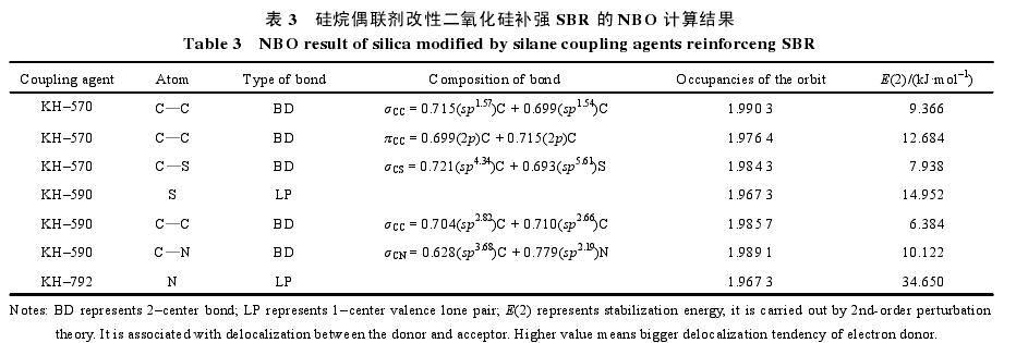 從表2幾何優(yōu)化的結(jié)果可以看出:3種偶聯(lián)劑與二氧化硅相連的Si—O都表現(xiàn)出部分雙鍵的性質(zhì),但在鍵長、電荷布居上并不完全相同。KH–792與SiO2形成的Si—O的鍵長最短,為1.650oA,電荷布居分析得到O的電負(fù)性也最大,為–1.22007。KH–590和KH–570與二氧化硅形成的Si—O的鍵長一樣,但在O的電負(fù)性上有差異分別為–1.21868和–1.19728。進(jìn)一步的NBO分析表明:這幾種硅烷偶聯(lián)劑與SiO2形成的Si—O均是由O的sp雜化軌道和Si的sp3雜化軌道成鍵,但在成鍵軌道上的電子占據(jù)有所差異,KH–792與SiO2形成的Si—O的軌道電子占據(jù)最大為1.9856,而KH–570和KH–590的電子軌道占據(jù)為1.9849。說明KH–792與SiO2形成的Si—O的電子云密度最大,說明它與SiO2結(jié)合最為緊密。同時(shí),KH–792改性的二氧化硅上的N與周圍的C之間形成了較大的電子共用區(qū)域,有較大的離域化趨勢,表明它與SBR的最低空軌道更易鍵合,成鍵應(yīng)該更為容易。