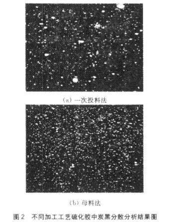 固定炭黑用量為20份,比較不同加工工藝對體系炭黑分散情況的影響,圖2中的白點代表的是未分散的炭黑。圖2(a)為一次投料法制得的試樣,其炭黑分散度(ASTM)平均值為84.23%,圖2(b)為母料法制得的試樣,其ASTM平均值為92.37%。這進一步說明了母料法更有利于炭黑的分散,體系綜合性能得到改善。