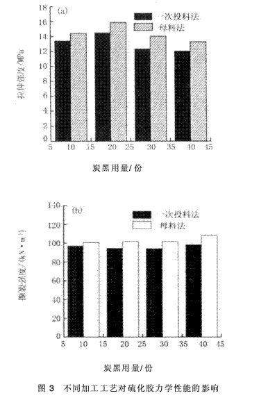 (3)母料法更有利于炭黑的分散,體系綜合性能得到改善。當炭黑用量為20份時,拉伸強度最佳,當炭黑用量為40份時,試樣的撕裂強度較好。