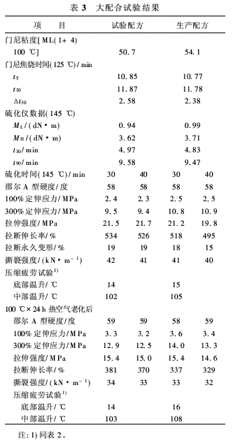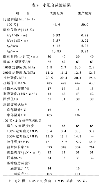 從表3可以看出,試驗配方和生產(chǎn)配方膠料的硫化速度基本一致,焦燒時間大體相同。試驗配方硫化膠老化前后的拉伸強度、拉斷伸長率、撕裂強度和壓縮疲勞溫升略優(yōu)于生產(chǎn)配方硫化膠,定伸應(yīng)力略小于生產(chǎn)配方硫化膠。與小配合試驗保持了較好的重現(xiàn)性。