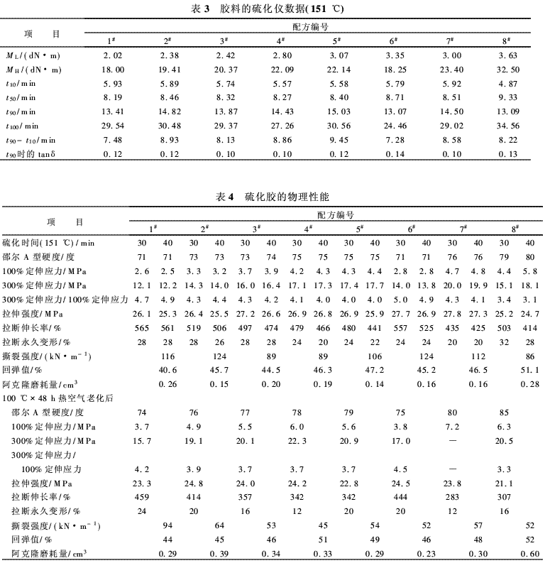 膠料的硫化儀數(shù)據(jù)如表3所示。從表3可以看出,1#配方膠料與6#配方膠料的MH,t90和(t90-t10)相差不大,這表明CSDPF與炭黑N115對膠料硫化速度的影響基本相同;與5#配方相比,6#配方膠料的MH較小,t90和(t90-t10)縮短,這表明CSDPF和白炭黑用量相同時(shí),硫黃和偶聯(lián)劑用量較大的膠料MH較大,硫化速度較慢;與7#配方相比,1#和8#配方膠料t90時(shí)的tanδ(損耗因子)值較大,即滯后損失較大。